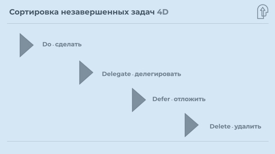 Поэтому, чтобы сохранить энергию и мотивацию, важно регулярно проводить ревизию незавершенных дел. На слайде представлен инструмент для классификации 4D. Вам потребуется не менее часа, чтобы вдумчиво занести каждое невыполненное дело в одну из четырех категорий. При этом к каждой задаче важно написать конкретную дату, когда вы сможете к ней вернуться (это не относится только к блоку «Удалить»).